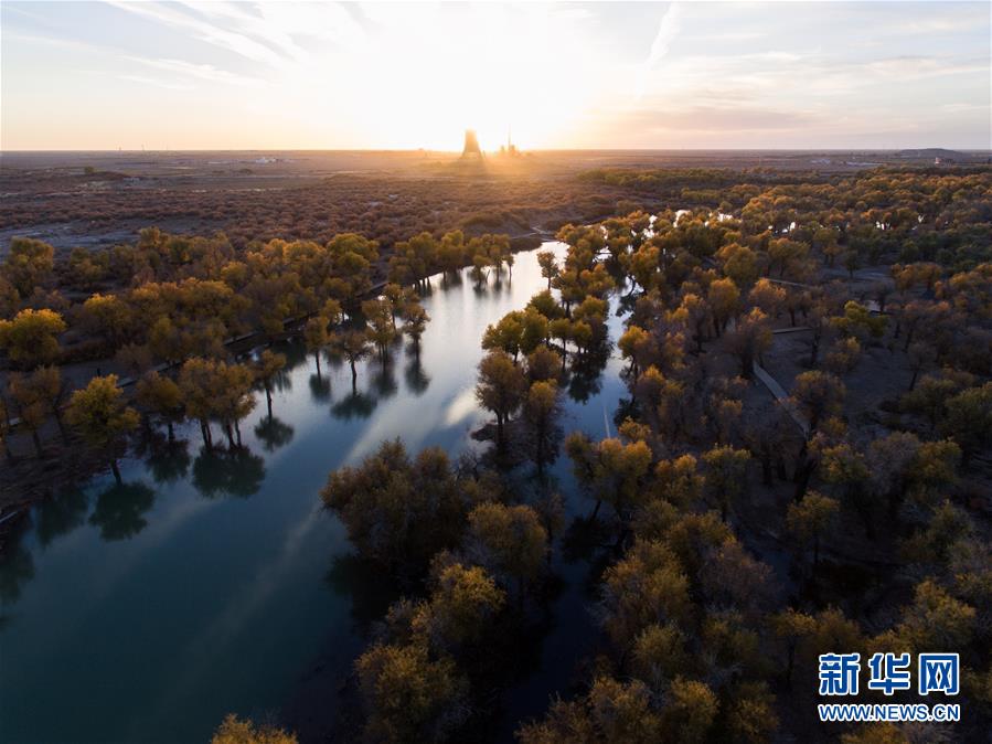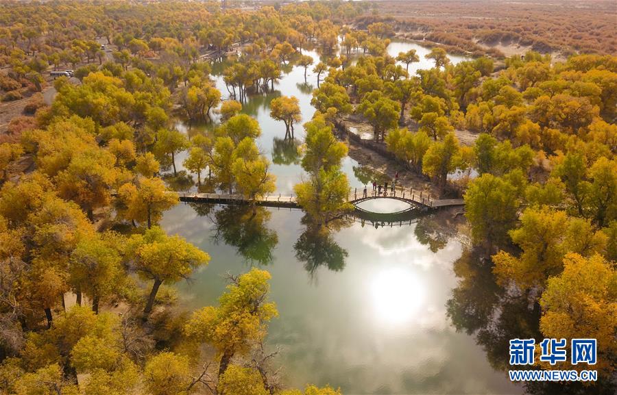 10月16日無人機(jī)拍攝的內(nèi)蒙古阿拉善盟額濟(jì)納旗境內(nèi)的胡楊林。新華社記者彭源攝