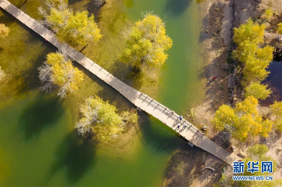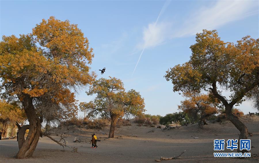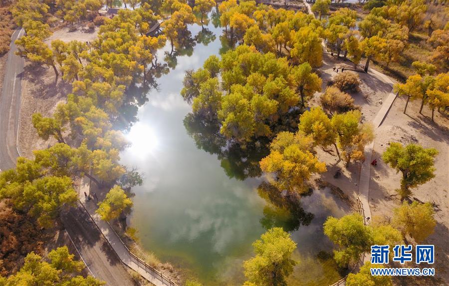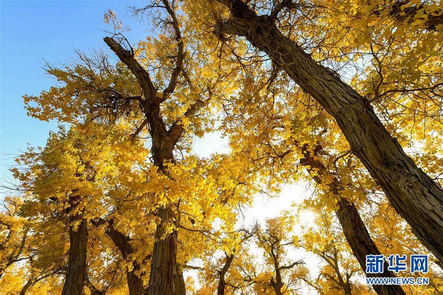 大片的胡楊樹葉由綠變黃,一眼望去,陽光下金色的樹葉襯著湛藍(lán)的天空于風(fēng)中婆娑起舞。