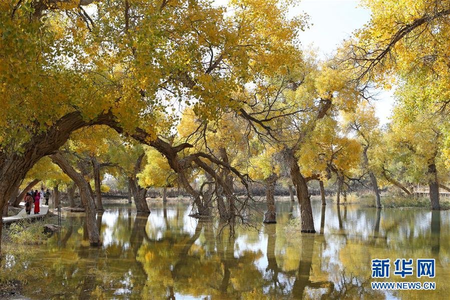 10月16日,游客在內(nèi)蒙古自治區(qū)額濟(jì)納旗的胡楊林游覽。新華社記者丁洪法攝