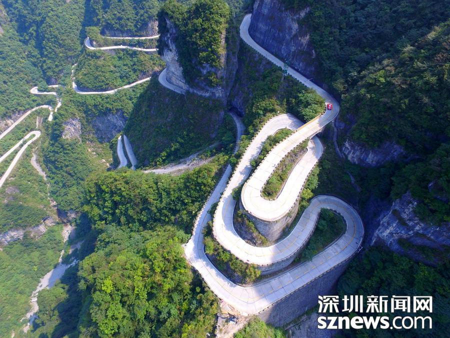 天門山盤山公路位于湖南省張家界市境內(nèi)的國家森林公園天門山上,盤山公路全長10.77公里,海拔從200米急劇提升到1300米,大道兩側(cè)絕壁千仞,空谷幽深,共計99個彎,180度急彎此消彼長,似玉帶環(huán)繞,航拍鏡頭下蜿蜒曲折的道路彎彎緊連,層層迭起,宛如迷宮般的“納斯卡線條”,被譽為“天下第一公路奇觀”,同時它也是世界上最危險的十大公路之一。