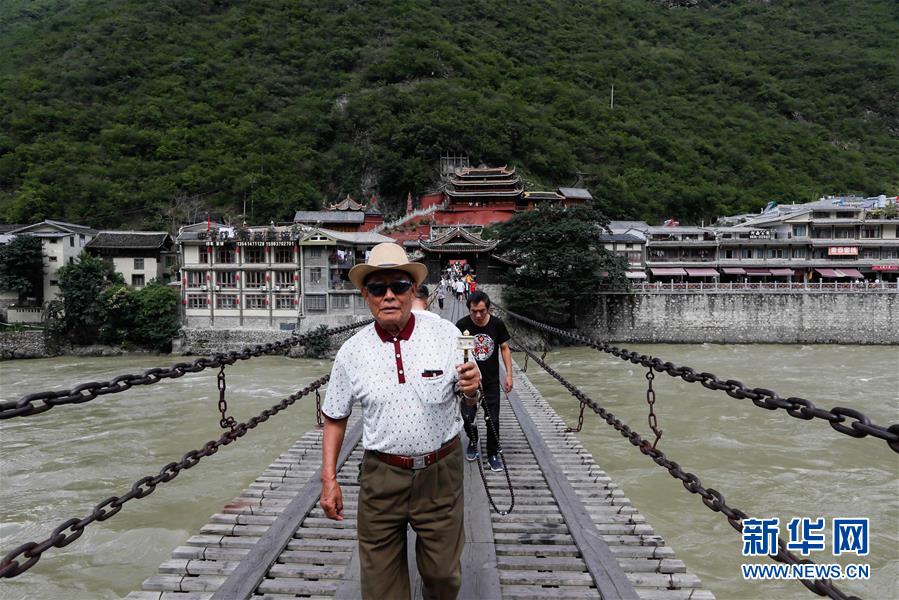 一位當?shù)夭刈謇先私?jīng)過瀘定橋(6月27日攝)。 新華社記者 江宏景 攝