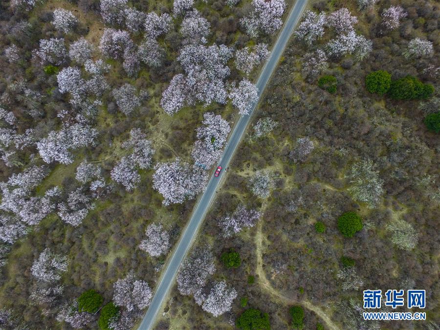 這是經(jīng)過林芝波密境內(nèi)桃花叢的公路(2016年4月1日無人機拍攝)。 新華社記者 普布扎西 攝