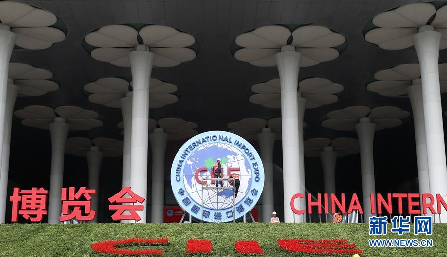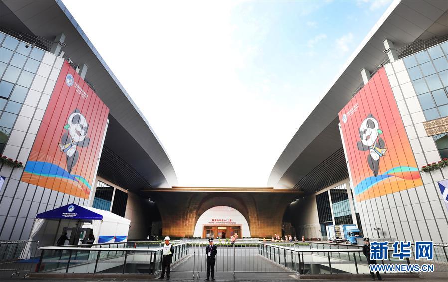 這是10月25日拍攝的國家會展中心(上海)西入口處。 第二屆中國國際進口博覽會開幕在即,在進博會舉辦地、國家會展中心(上海)內(nèi),展館搭建施工人員和展會志愿者們在進行從展臺搭建到完善觀展標識等的布展準備工作。   新華社記者 方喆攝