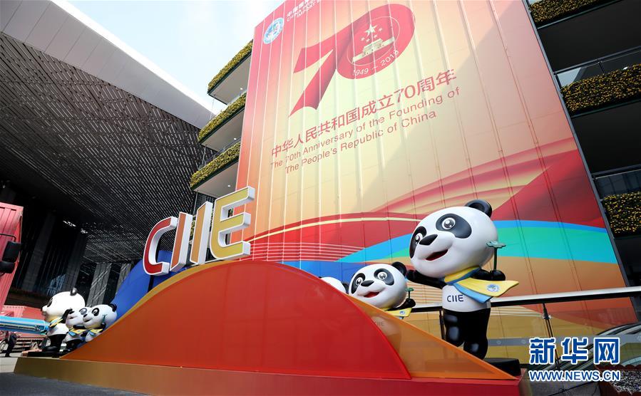 10月25日,國家會展中心(上海)內(nèi)慶祝國慶的裝飾前擺放了進博會標識和吉祥物熊貓進寶。  新華社記者 方喆攝