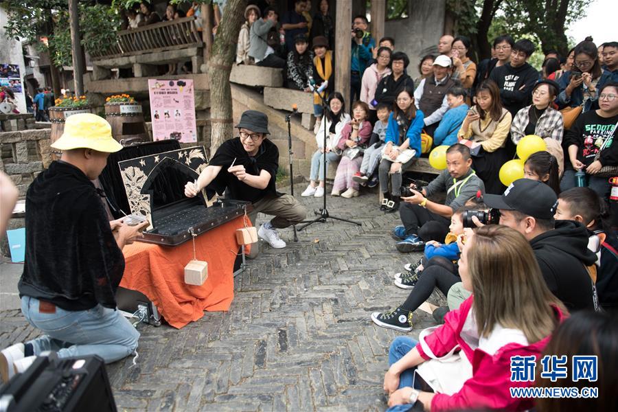 10月26日,一個(gè)劇團(tuán)在烏鎮(zhèn)街頭表演。 新華社記者翁忻旸攝