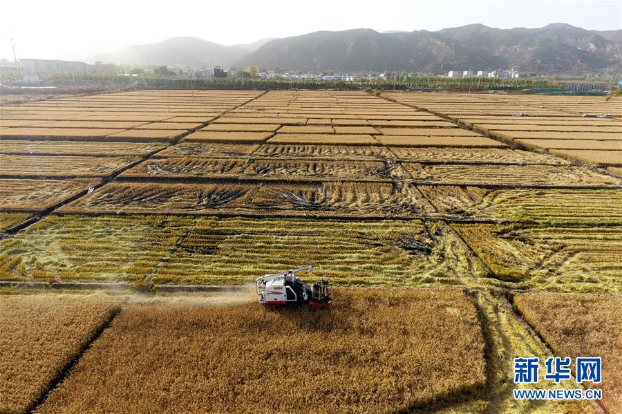 收割機(jī)在太原市晉源區(qū)赤橋村稻田里作業(yè)(10月28日無(wú)人機(jī)拍攝)。新華社記者詹彥攝