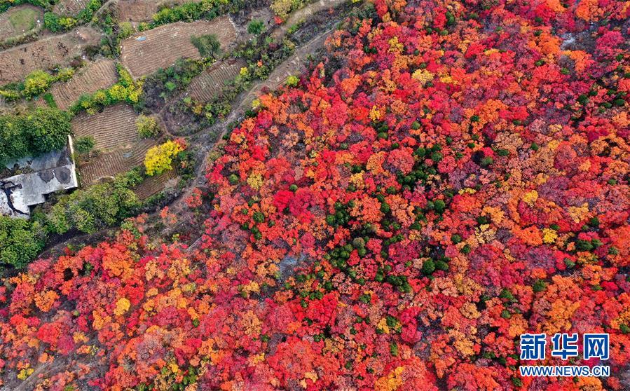 濟(jì)南蝎子山上火紅的黃櫨樹(shù)林(11月4日無(wú)人機(jī)拍攝)。 新華社記者 朱崢 攝