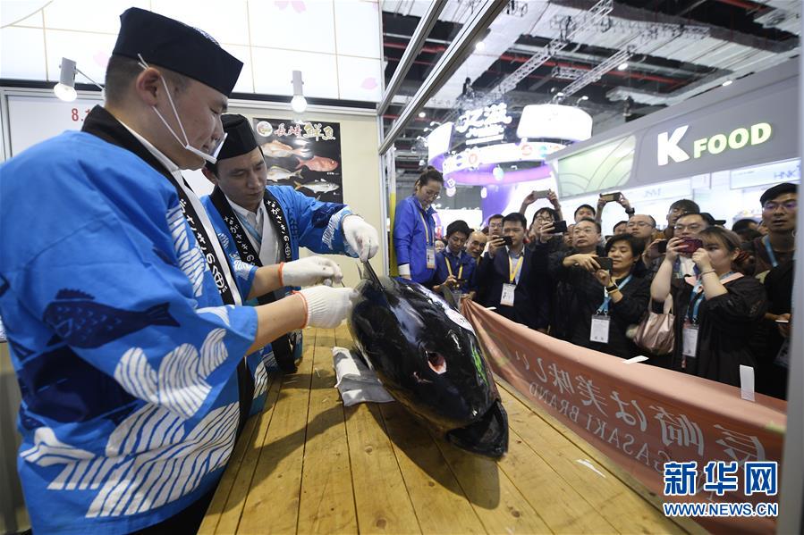 11月7日,來自日本長崎魚市株式會社的專業(yè)切魚師傅為解體70公斤藍鰭金槍魚做準(zhǔn)備。第二屆中國國際進口博覽會正在上海國家會展中心舉行。博覽會的食品及農(nóng)產(chǎn)品展區(qū)里匯集了來自世界各地的美食,同時也上演各種精彩美食秀。11月7日,來自日本長崎魚市株式會社的專業(yè)切魚師傅現(xiàn)場解體一條70公斤的藍鰭金槍魚,吸引大量參觀者觀看、品嘗。新華社記者王鵬攝