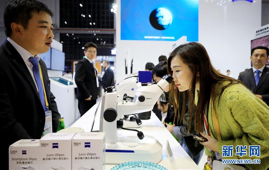 在第二屆進博會裝備展區(qū)德國蔡司公司展臺,參觀者體驗一款數(shù)碼互動教學系統(tǒng)產品(11月8日攝)。新華社記者方喆攝