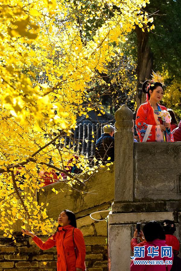 11月11日,人們?cè)诖笥X寺內(nèi)的古銀杏樹旁留影。新華社記者尹棟遜攝