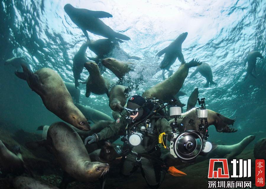 32歲的 Maxwel Hohn是一名水下攝影師,日前,他潛入加拿大溫哥華海域,沒想到撞見海獅“大軍”,這50來只家伙對于 Maxwel的出現(xiàn)興奮不已,立刻將他團團圍住,仿佛進了盤絲洞。