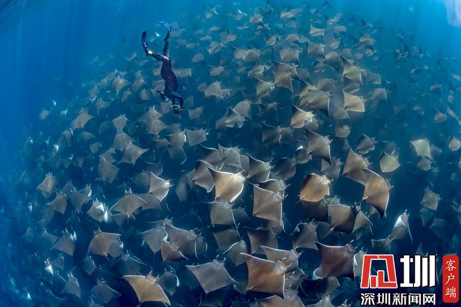 2019年5月31日報道(圖片拍攝于4月23日),環(huán)保活動家兼潛水教練Jay Clue上個月在墨西哥下加利福尼亞州洛斯卡沃斯附近海岸,幸運地邂逅了一支蝠鲼遷徙大軍,數(shù)百只蝠鲼浩浩蕩蕩在海水中行進,畫面十分震撼。