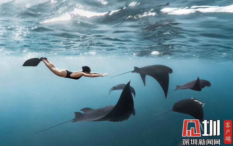 2019年7月2日報道(具體拍攝時間不詳),印度尼西亞科莫多國家公園,美國自由潛水愛好者Kristina Zvaritch一次潛水時,她的正下方恰巧游著幾只巨大的蝠鲼,這令人驚艷的一幕恰巧被她的丈夫拍下來了。當(dāng)她看到這些照片時,自己都被驚呆了。晶瑩剔透的海水使這張照片有了視覺錯位的效果,讓人以為Kristina與這些魚處于相同的高度,但實際上她離這些魚還有10-19英尺左右的距離。