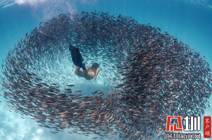 2019年3月12日報道(具體拍攝時間不詳),澳大利亞21歲的姑娘L(fēng)illy Palmer和朋友在西澳大利亞州西北海岸的寧格羅礁邂逅鸚嘴魚“風(fēng)暴”,Lilly用相機拍下了朋友潛進(jìn)鸚嘴魚群的畫面。照片中,鸚嘴魚群組成一個球形“風(fēng)暴”,仿佛將Lilly的朋友一個個吸進(jìn)去一樣,畫面分外震撼。