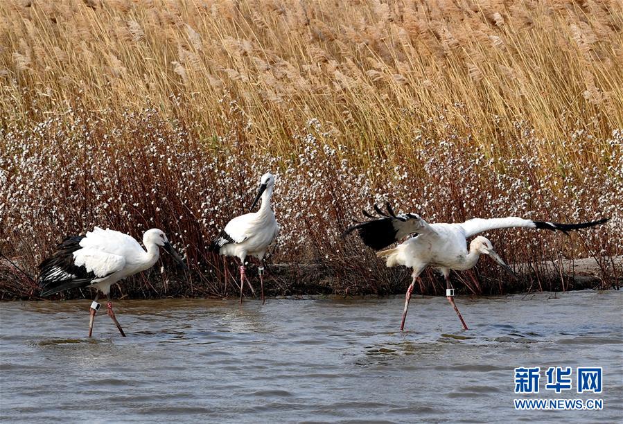 這是在樂亭縣野生動物保護協(xié)會大清河鳥類救助站放飛回歸大自然的三只國家一級保護動物東方白鸛(11月16日攝)。新華社記者楊世堯攝