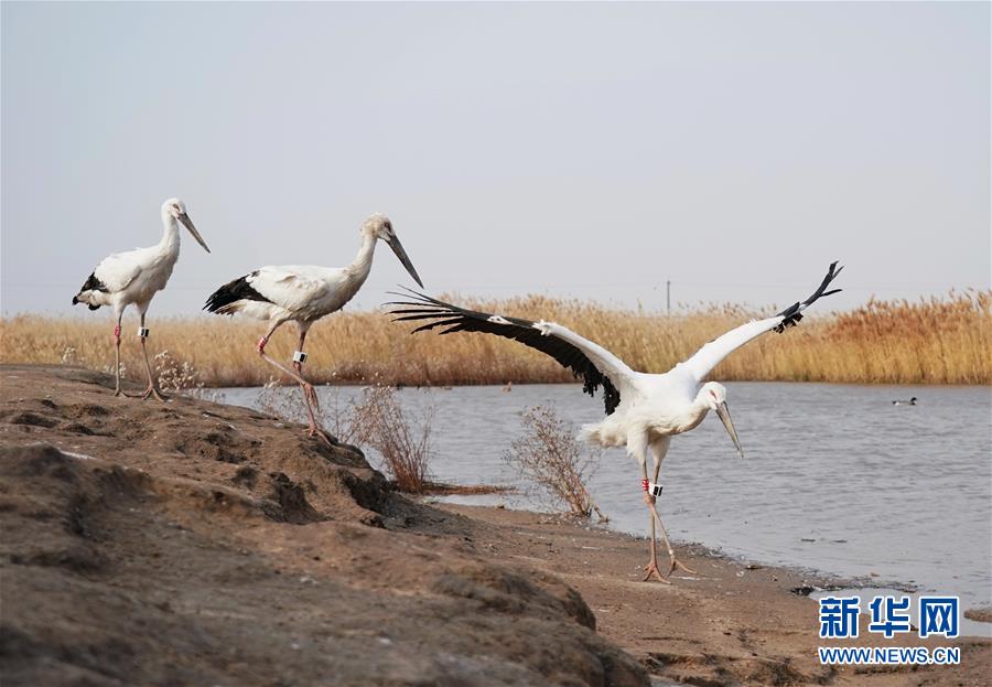 這是在樂亭縣野生動(dòng)物保護(hù)協(xié)會(huì)大清河鳥類救助站放飛回歸大自然的三只國(guó)家一級(jí)保護(hù)動(dòng)物東方白鸛(11月16日攝)。新華社記者楊世堯攝