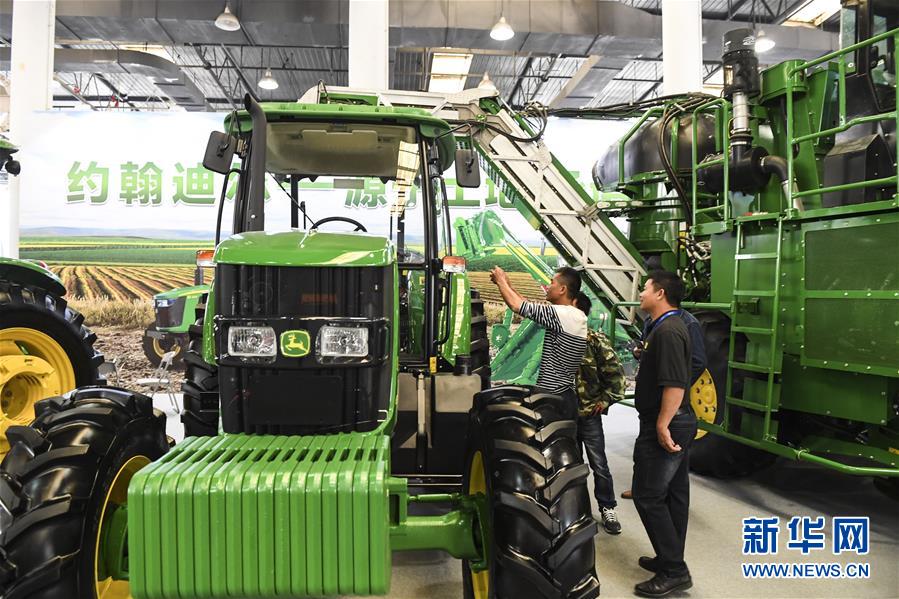 11月16日,參觀者在展會現(xiàn)場參觀甘蔗收割機(jī)械設(shè)備。新華社記者曹祎銘攝