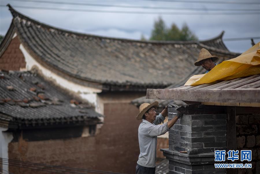 工人邱社云(左)在石屏縣異龍鎮(zhèn)符家營村211號民居修繕圍墻(8月8日攝)。新華社記者江文耀攝