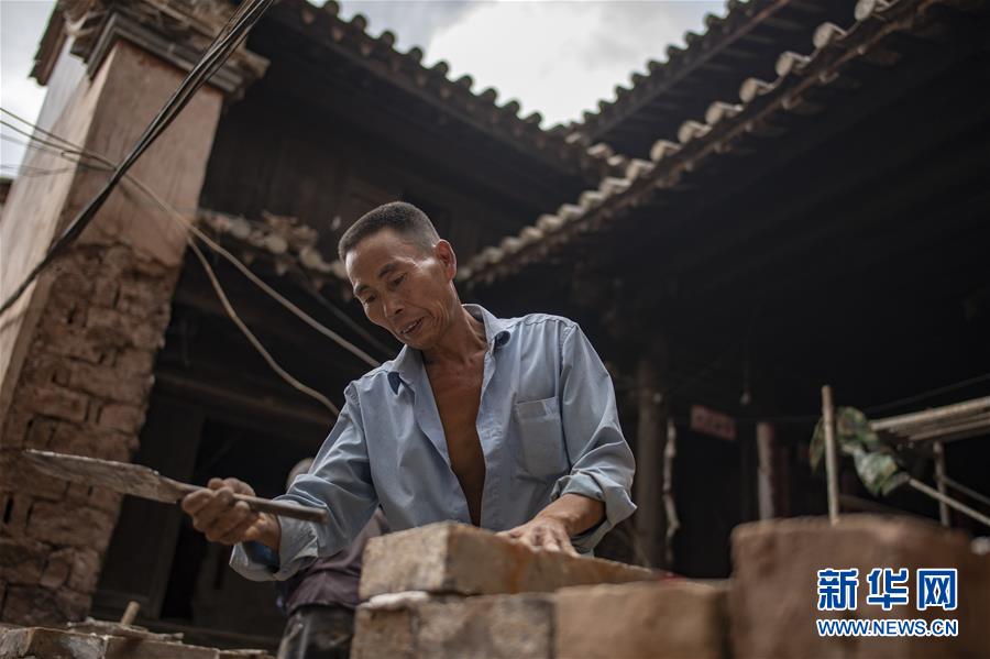 工人王建雄在修繕石屏縣異龍鎮(zhèn)符家營(yíng)村189號(hào)民居的圍墻(8月8日攝)。新華社記者江文耀攝