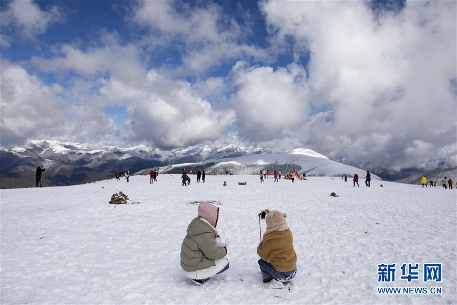 在318國(guó)道四川卡子拉山埡口,游人在雪地里留影、嬉戲(10月17日攝)。新華社記者江宏景攝