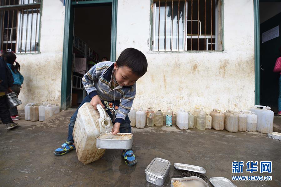 在廣西大化瑤族自治縣板升鄉(xiāng)八好小學(xué),一名學(xué)生喝水桶里的雨水(2014年11月24日攝)。八好小學(xué)有400多名學(xué)生,曾僅有一個不足100立方米的水柜,用于收集儲存樓頂?shù)挠晁?,學(xué)生需定期定量用水。遇到長時間不下雨,學(xué)校需要到鄉(xiāng)政府所在地運水。如今,學(xué)校修建了5個大水柜,并從兩公里外引泉水到校園,飲水難問題得到解決。新華社記者黃孝邦攝