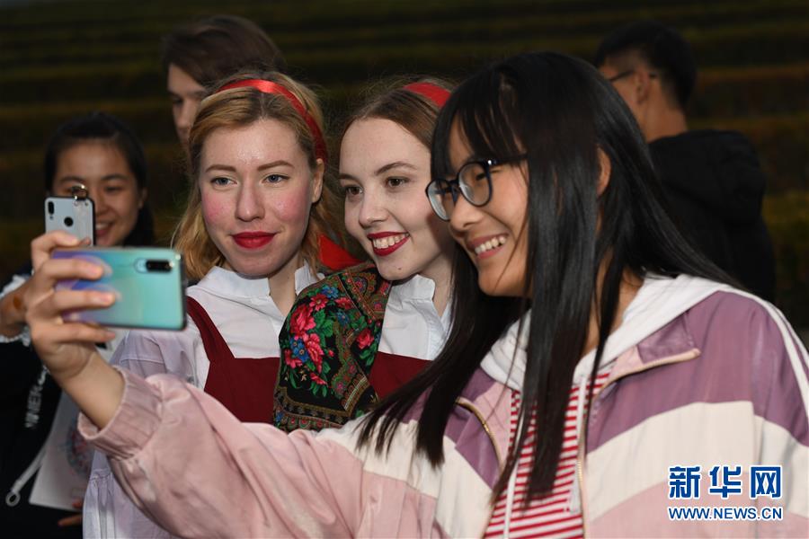 11月17日,來(lái)自俄羅斯的留學(xué)生在國(guó)際文化節(jié)上與觀眾合影。新華社記者 張端 攝