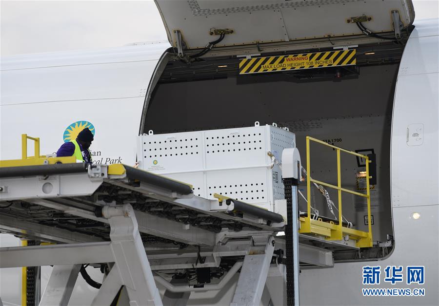 11月19日,在美國華盛頓附近的杜勒斯國際機(jī)場,裝有大熊貓“貝貝”的箱子被運(yùn)上飛機(jī)。 新華社記者 劉杰 攝