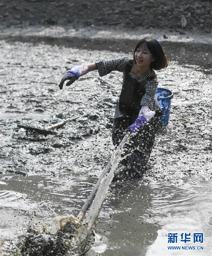 杭州:游客體驗“干塘”捕魚