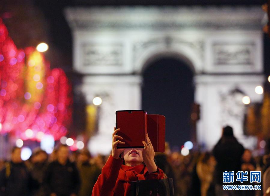 11月24日,在法國巴黎,一名女子在香榭麗舍大街點燈儀式上拍照。當(dāng)日,法國巴黎香榭麗舍大街點亮彩燈迎圣誕。從即日起至1月8日,整條香榭麗舍大街都將被喜慶的節(jié)日燈飾點亮。新華社記者高靜攝