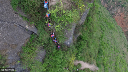 四川省涼山彝族自治州昭覺縣支爾莫鄉(xiāng)阿土勒爾村,是一座名副其實的“懸崖村”,72戶人家居住在這里,處于美姑河大峽谷斷坎巖肩斜臺地,海拔1400多米,與地面垂直距離約800米。5月14日,放學路上,孩子們在攀爬藤梯。圖片來源:視覺中國