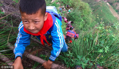 上學的孩子都背著沉沉的書包,大多數(shù)是女孩,15個孩子在三個家長的保護下,大約用了2個小時,到達“懸崖村”。上山容易下山難,遇到雨雪天氣,村里人就不再外出了。圖片來源:視覺中國