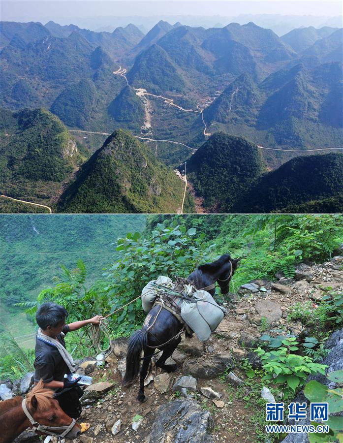 拼版照片:上圖為已經(jīng)修通水泥路的大化瑤族自治縣板升鄉(xiāng)八好村八好屯(11月11日無人機拍攝);下圖為在尚未通路的八好村八好屯,村民背著化肥走山路回家(2016年4月15日攝)。新華社記者黃孝邦攝