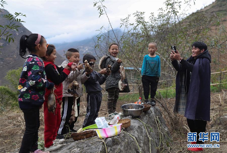 11月24日,在昭覺縣支爾莫鄉(xiāng)阿土列爾村,村民阿牛用手機(jī)拍攝孩子們向大家拜年的視頻。新華社記者江宏景攝