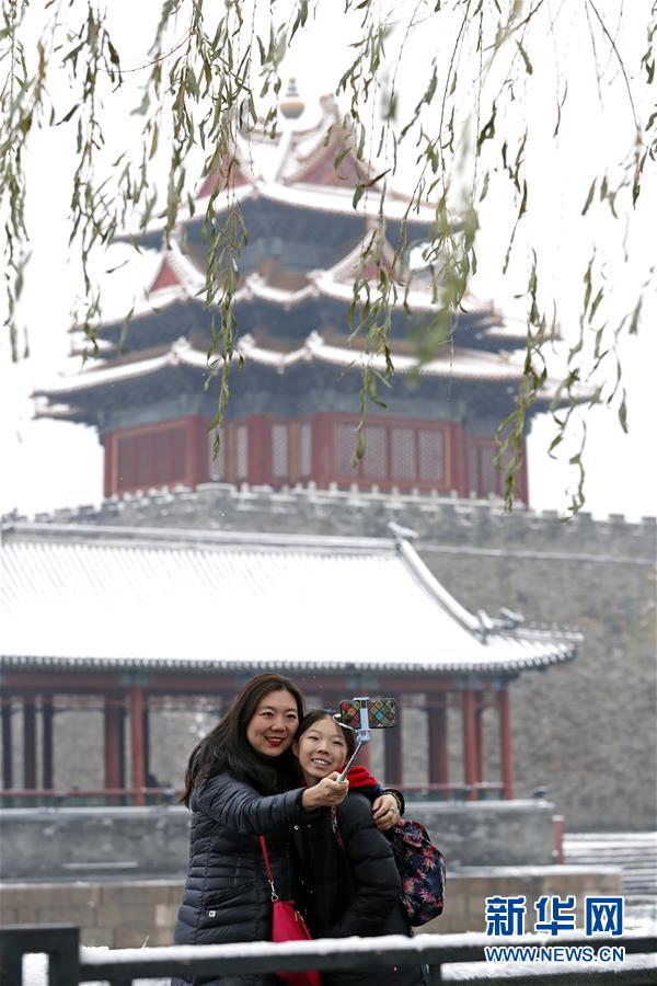 11月30日,人們在雪后的故宮角樓附近拍照。 新華社記者 沈伯韓 攝