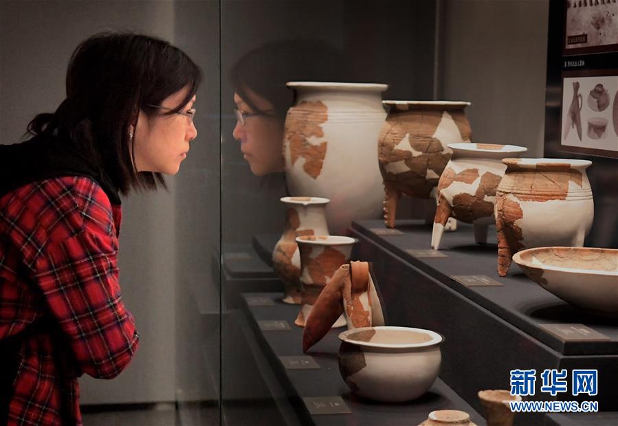 10月19日,參觀者在二里頭夏都遺址博物館內(nèi)觀看展出的陶器。新華社記者李安攝