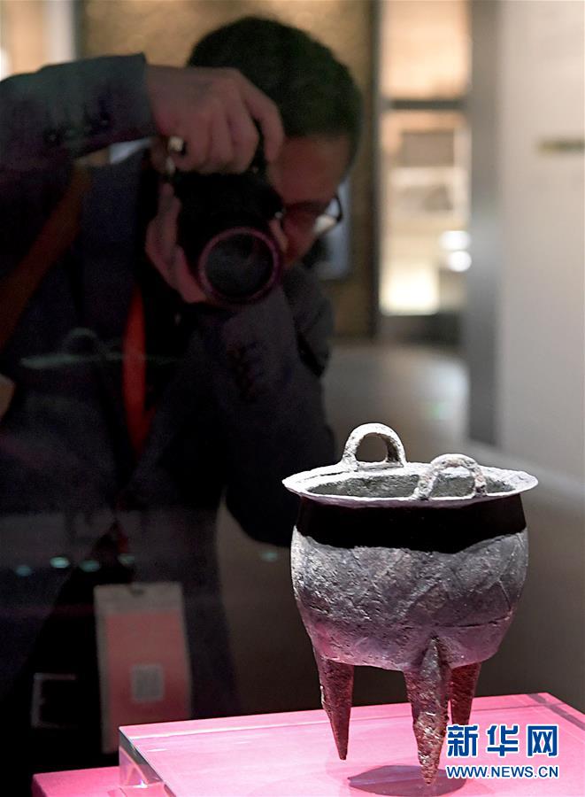 10月19日,參觀者在二里頭夏都遺址博物館內(nèi)拍攝展品“乳釘紋銅爵”。新華社記者李安攝