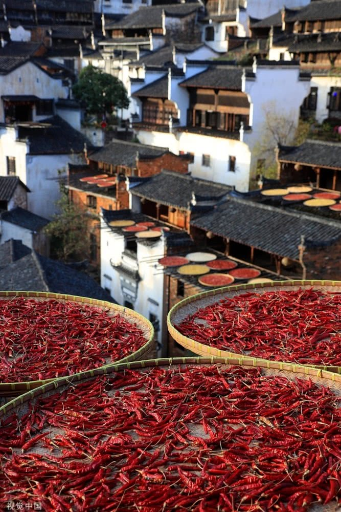 2018年8月7日,江西婺源縣篁嶺古村落,壯觀“曬秋”場景。當(dāng)日立秋節(jié)氣,江西婺源縣篁嶺古村的農(nóng)作物普遍豐收,村民們又迎來了一年一度的“曬秋”季。村民們將收獲來的紅辣椒、玉米、南瓜、稻谷和菊花等色彩斑斕的農(nóng)作物,晾曬在依山而建的徽派民居房前屋后的木制曬架上,在秋日陽光的照射下,色彩繽紛圓圓的曬扁,鋪就在錯(cuò)落有致的徽派民居之間,格外璀璨奪目,蔚為壯觀。目前,“篁嶺曬秋”已經(jīng)成為中國鄉(xiāng)村旅游的一張名片。
