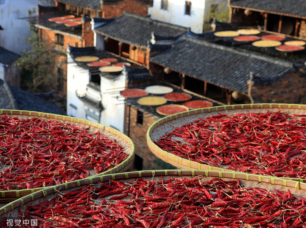 秋天,是收獲的季節(jié)。安徽省黃山市呈坎古村村民將收獲歸倉的玉米、黃豆、紅辣椒等農(nóng)作物果實(shí)因地制宜晾曬,在古村曬場上描繪出一幅豐收曬秋圖。