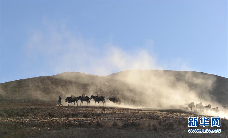 12月6日,騾馬隊馱負(fù)工程物料前往山頂塔基施工現(xiàn)場。新華社記者侯捷攝