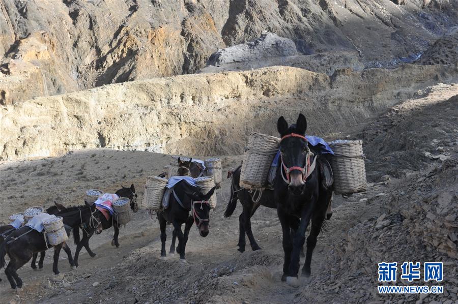 12月6日,騾馬隊馱負(fù)工程物料前往山頂塔基施工現(xiàn)場。新華社記者李楨宇攝