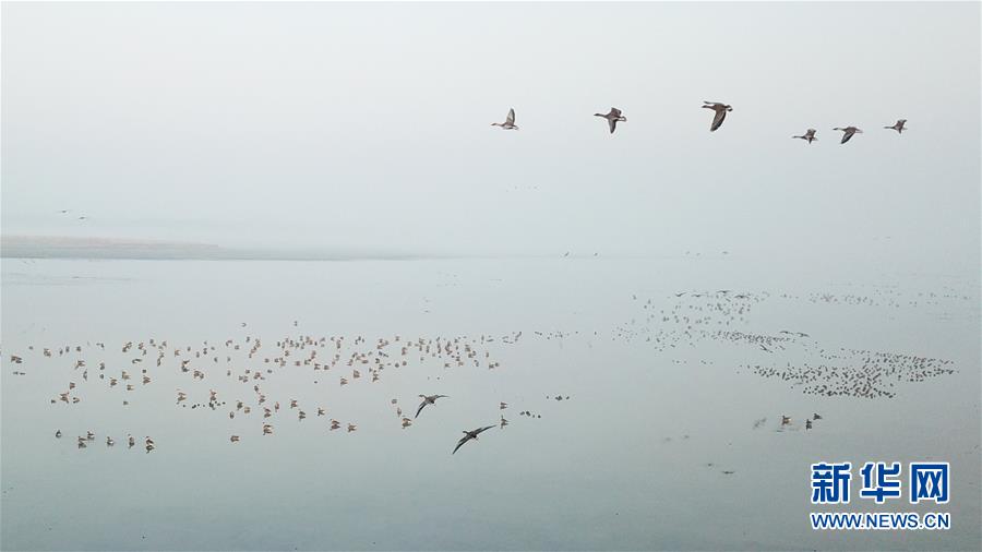12月7日,候鳥在升金湖上空飛翔(無人機拍攝)。新華社記者張端攝