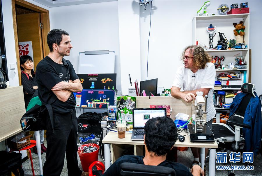 在深圳市福田區(qū)華強北一個創(chuàng)客孵化器內(nèi),來自荷蘭阿姆斯特丹的衛(wèi)國(右一)與來自不同國家的創(chuàng)客交流(2018年10月25日攝)。 新華社記者 毛思倩 攝