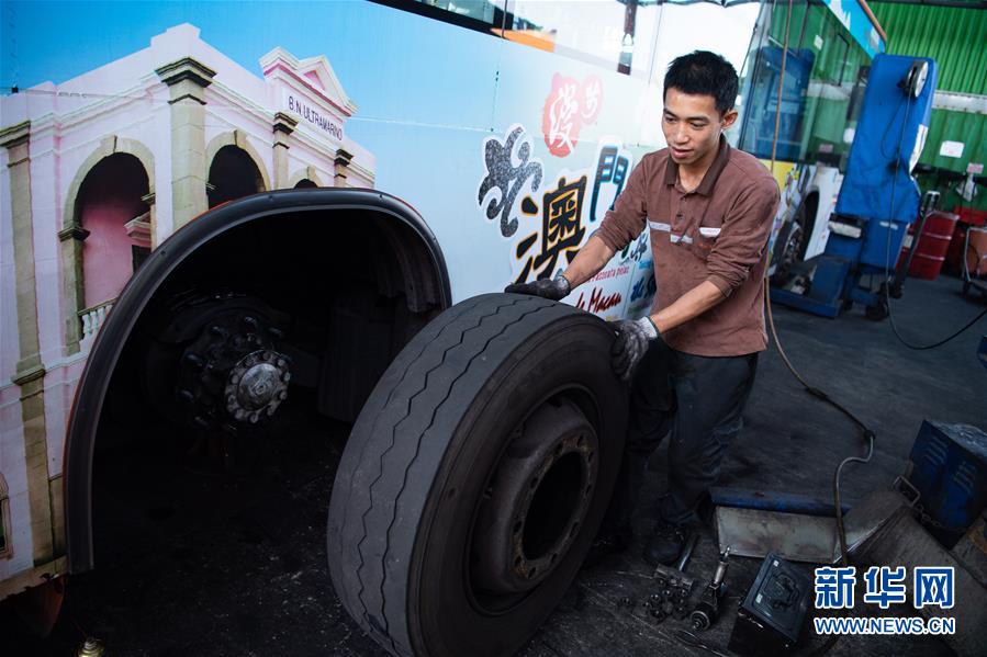 11月26日,澳門公共汽車股份有限公司鄭家松在工作,他已經(jīng)工作了2年,主要負責為公交車做定期保養(yǎng)及維修。 新華社記者 張金加 攝