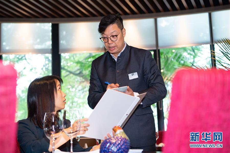 11月26日,澳門旅游學(xué)院教學(xué)餐廳的曾日升在餐廳內(nèi)協(xié)助顧客點(diǎn)菜,他已經(jīng)工作了22年,主要負(fù)責(zé)處理餐廳事項(xiàng)及教導(dǎo)學(xué)生。  新華社記者 張金加 攝