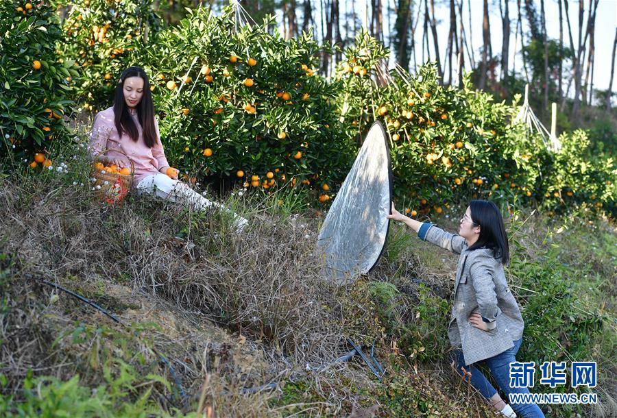 李柳萍在果園里拍攝鹿寨蜜橙宣傳片(12月12日攝)。新華社記者黃孝邦攝