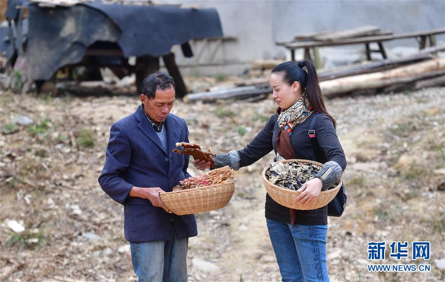 在鹿寨縣拉溝鄉(xiāng)木龍村,李柳萍(右)到五保戶李建文家收購(gòu)木耳、干筍等(12月14日攝)。新華社記者黃孝邦攝