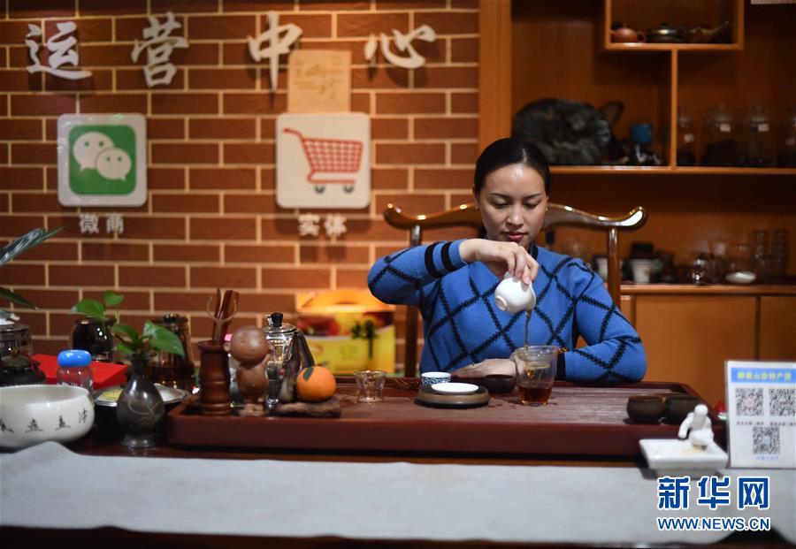 李柳萍在特產(chǎn)館里泡茶迎賓(12月13日攝)。新華社記者黃孝邦攝