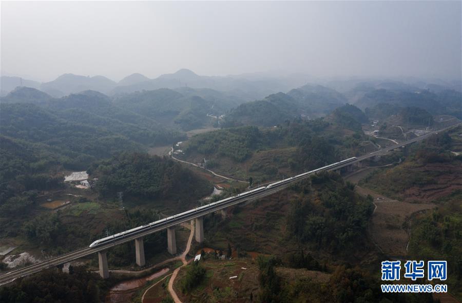12月2日,一輛試驗列車駛過成貴高鐵鴨池河特大橋。新華社記者劉續(xù)攝
