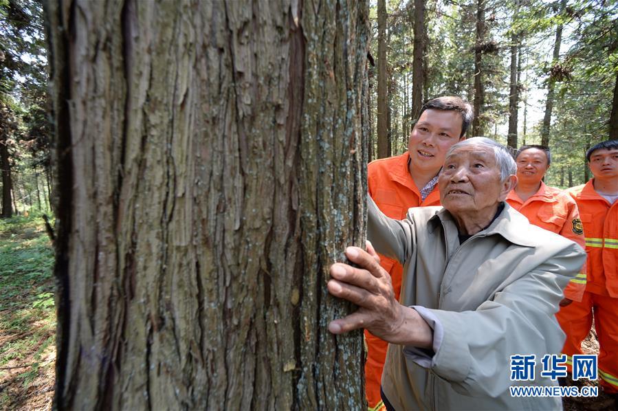 4月27日,在貴州省畢節(jié)市赫章縣平山國有林場,李代關(guān)老人(前)在查看當(dāng)年和同事種的杉樹。今年88歲的李代關(guān)是貴州省畢節(jié)市赫章縣平山國有林場的一名退休職工,他1958年參加工作,成為一名林業(yè)工人,把畢生奉獻(xiàn)給了林業(yè)事業(yè)。在李代關(guān)的感召下,他的兒子和孫子都成為了護(hù)林員。經(jīng)過幾代林業(yè)工人的努力,截至2018年底,赫章縣平山鎮(zhèn)的森林覆蓋率已達(dá)66.7%。新華社記者楊楹攝