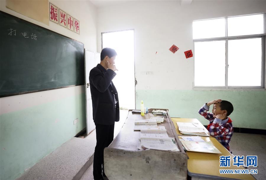 5月8日,王北海(左)在教室內(nèi)為陳威宇講解“打電話”的流程。江西省瑞金市大柏地鄉(xiāng)三河小學(xué)坐落于大山深處。陳威宇是學(xué)校里唯一的學(xué)生。陳威宇今年9歲,家庭貧困,上學(xué)不便。為解決這一難題,當(dāng)?shù)卣疀Q定恢復(fù)陳威宇家附近三河小學(xué)的辦學(xué)工作,今年46歲的王北海被安排為專職教師,從周一至周五,王北海幾乎每天24小時陪伴在陳威宇身旁,既當(dāng)老師也當(dāng)“家長”,照料他的學(xué)習(xí)和生活。新華社記者蘭紅光攝